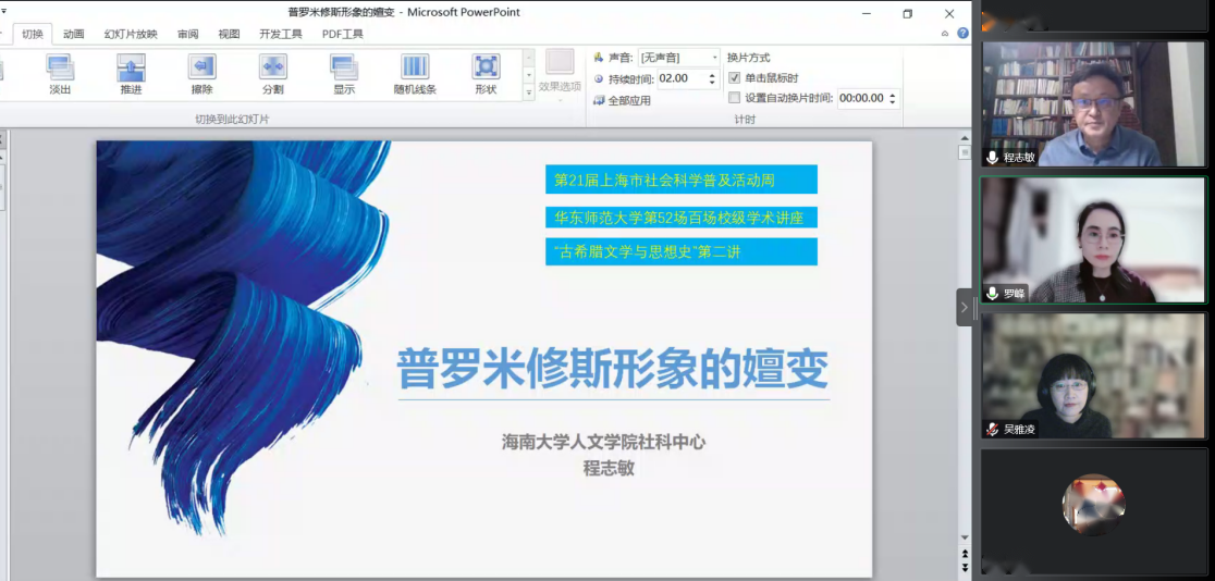 2022年10月18日晚18点,应365英国上市官网在线邀请,海南大学社科中心教授、中国古典学学会常务理事程志敏老师,为我院师生做了主题为“普罗米修斯形象的嬗变”的讲座。本次讲座入选第21届上海市社会科学普及活动周,系百场校级学术讲座第52讲。讲座由英语系罗峰副教授主持,逾300名校内外师生以腾讯会议的方式线上参与。