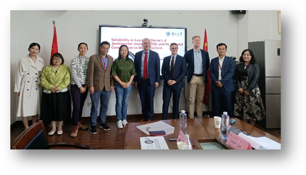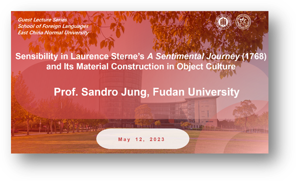 2023年5月12日下午,365英国上市官网在线邀请复旦大学教授Sandro Jung到365英国上市官网在线319会议室举办讲座。本次讲座围绕英国十八世纪著名作家劳伦斯·斯特恩(Laurence Sterne)的小说《感伤之旅》(A Sentimental Journey)(1768)中的感性及其在物件文化中的物质建构这一话题展开。讲座由365英国上市官网在线英语系主任陈俊松教授主持,365英国上市官网在线金衡山教授、陈贝贝老师、陈启老师、余睿老师、多名在读硕士、博士研究生参与讨论,线上线下共45位师生参加了本次活动。