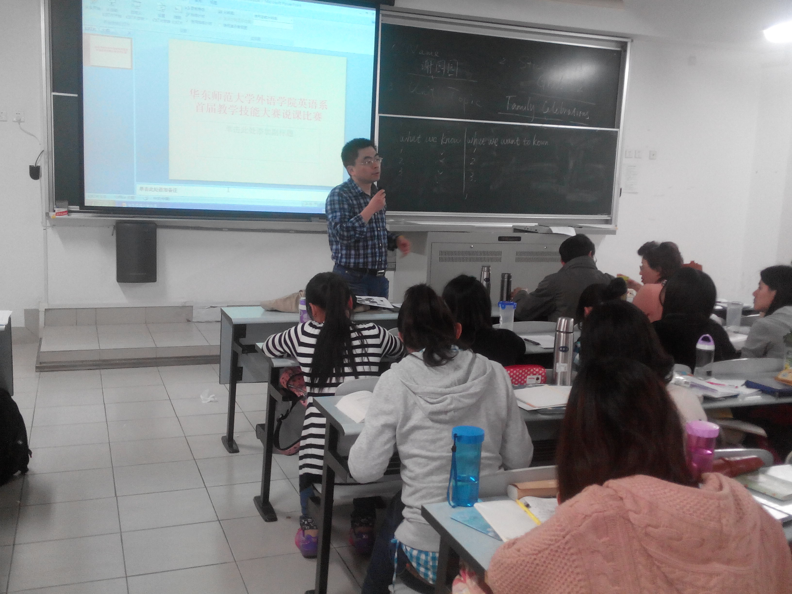 为了对每名选手教学技能进行全面地考察,本次说课比赛要求选手首先在黑板上写下自己及授课内容的基本信息,接着结合PPT在十分钟内进行英文说课,之后留有五分钟时间回答评委老师的提问,最后评委根据其表现从教学目标、教学过程、教学技能等方面进行打分。