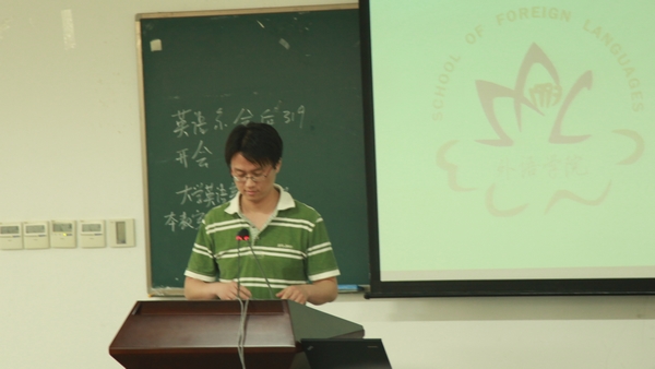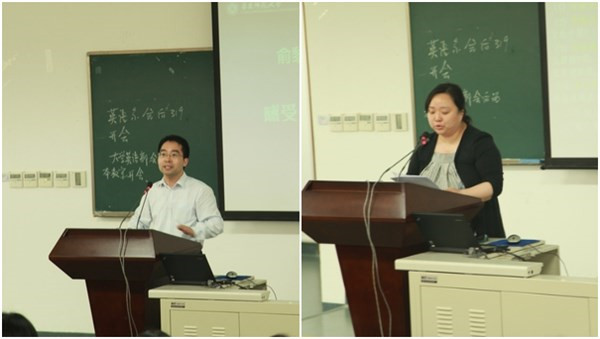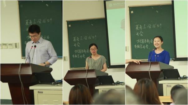 考核环节之后,院长袁筱一向大家介绍了新近加盟学院的英语系杨延宁教授、院部王迎霞和周俊辰老师,三位新外院人先后上台发言。随后,袁筱一就本学期学院工作做了总结,回顾了本学期学院教学、科研、学生、文化等各项工作的开展情况,与大家分享了学院师生所取得的累累硕果。袁筱一还通报了学校刚刚评选出来的2014年度“学生心目中最优秀教师奖” 以及获得各系评教排名前三名的教师,翻译系陈翔老师因连续五年被本科毕业生评选为优秀教师而摘得该项殊荣。